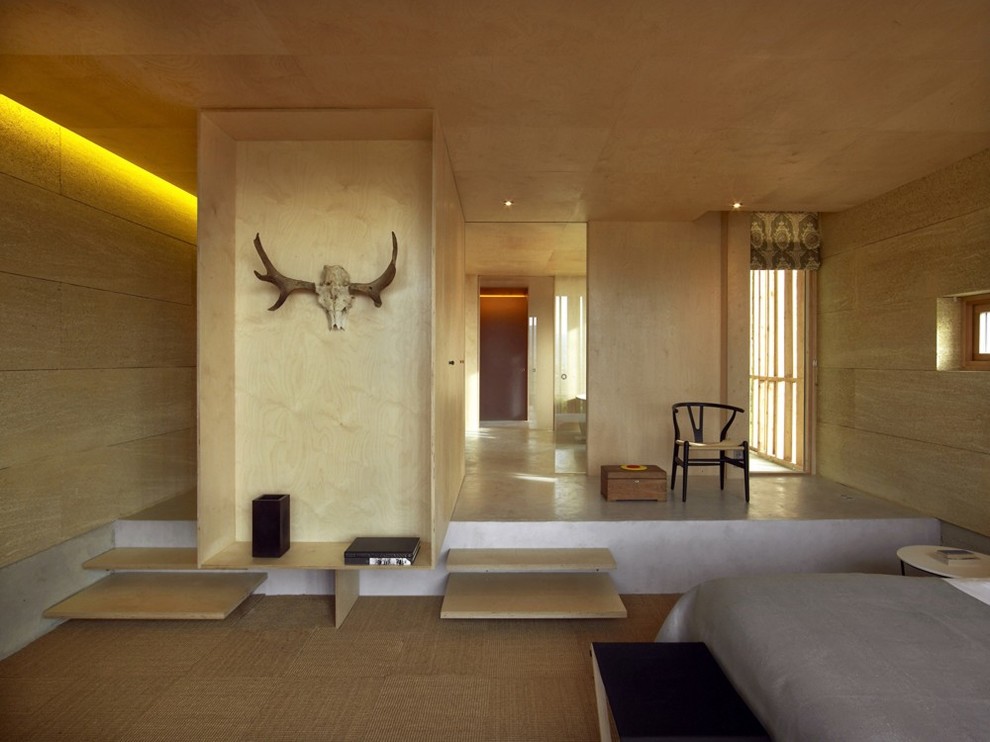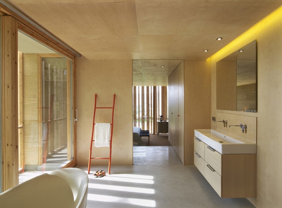 The glazed living room and open terraces under this roof maintain the transparency between the courtyard to the south and the broad views down the valley to the north. The open plan of the bedroom wing is structured by three distinct plywood volumes, like large crates integrating storage and wet spaces.
