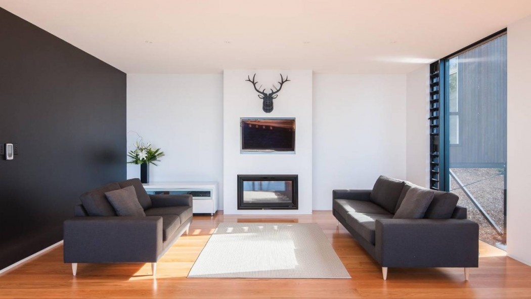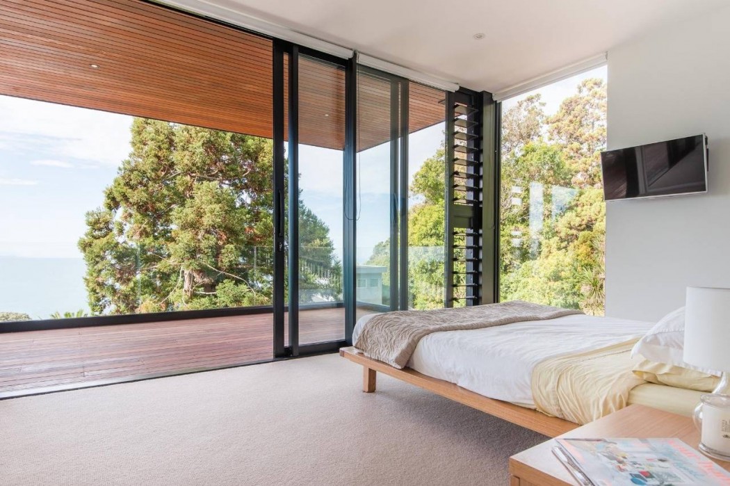 This modern cedar house designed by Iconic Homes is situated on a steep site in Whangaparaoa, New Zealand.