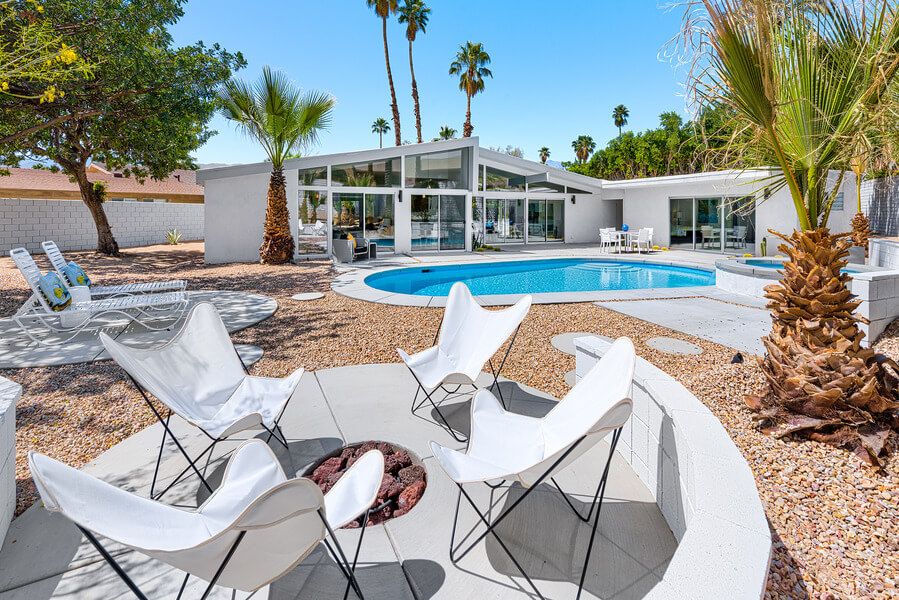 The Entertainers backyard features a new Pool with Waterfall Spa, Outdoor Dining, Fire-pit and Sun Lounging amongst the Architectural Landscaping. Developers Maus & Holstein concluded that Palmer & Krisel’s Valley of the Sun tract “displayed the hopefulness and easy lifestyle of Modernism in the 1950’s”, that statement still rings true today…Desert Living at it’s best!