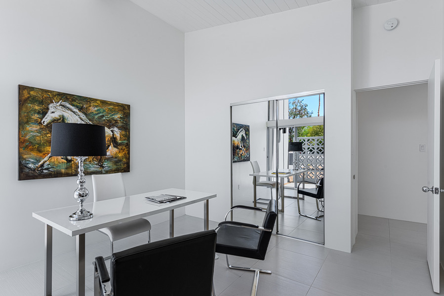 This rare and incredible home is one of two B-4 plans ever built. Custom designed by Palmer & Krisel to fit the pie shaped lot at the end of the “Bulb” (Cul-de-sac) and built by developers Maus & Holstein in 1958, the main house features 3 Bedroom, 2 Baths, an Open Living Room / Dining Room with High Angled Wood Beamed Ceilings, Clearstory Windows, a Social Gourmet Kitchen Design with spacious Breakfast Room looking out to the pool and backyard.