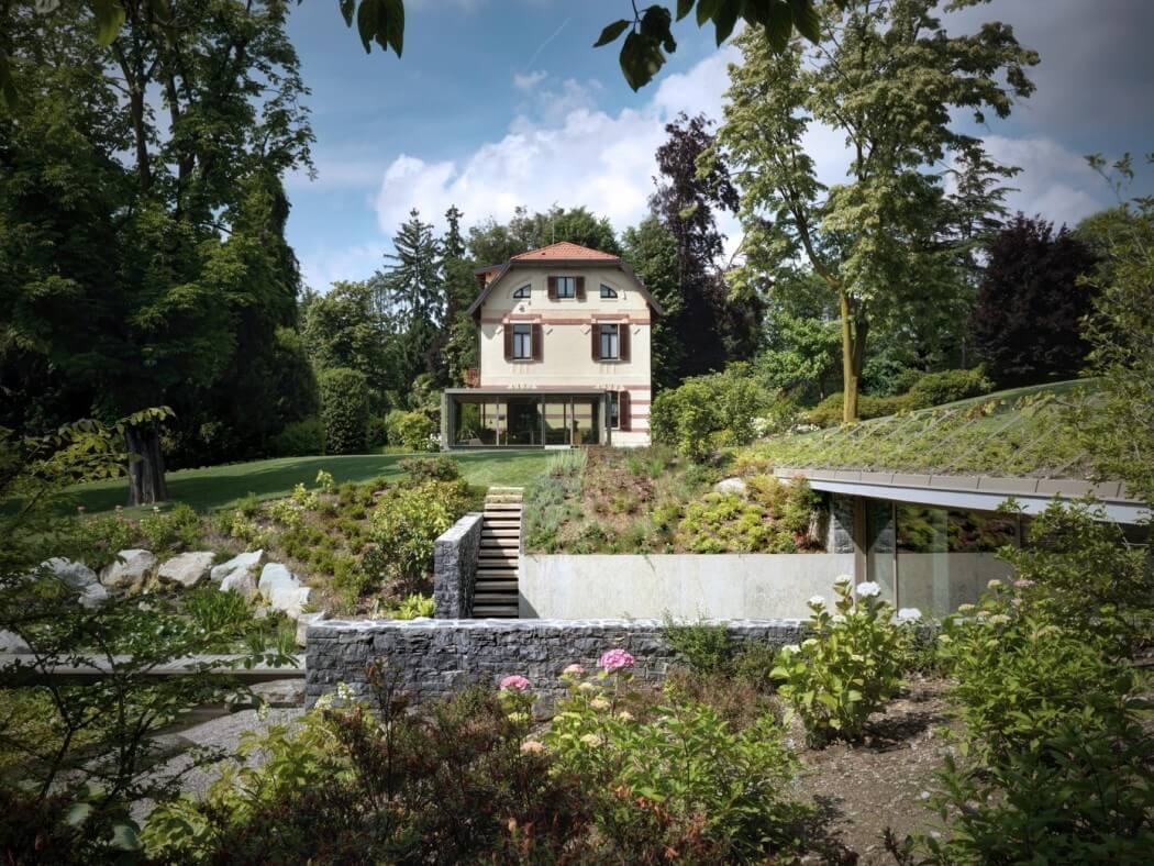 Locate the pavilion far away from the main house in a strategic position, to create a totally new and independent space reached by a path that emphasizes the sense of privacy. The location of the underground pavilion far away from the house would then create an interesting and dynamic relationship between the two spaces.