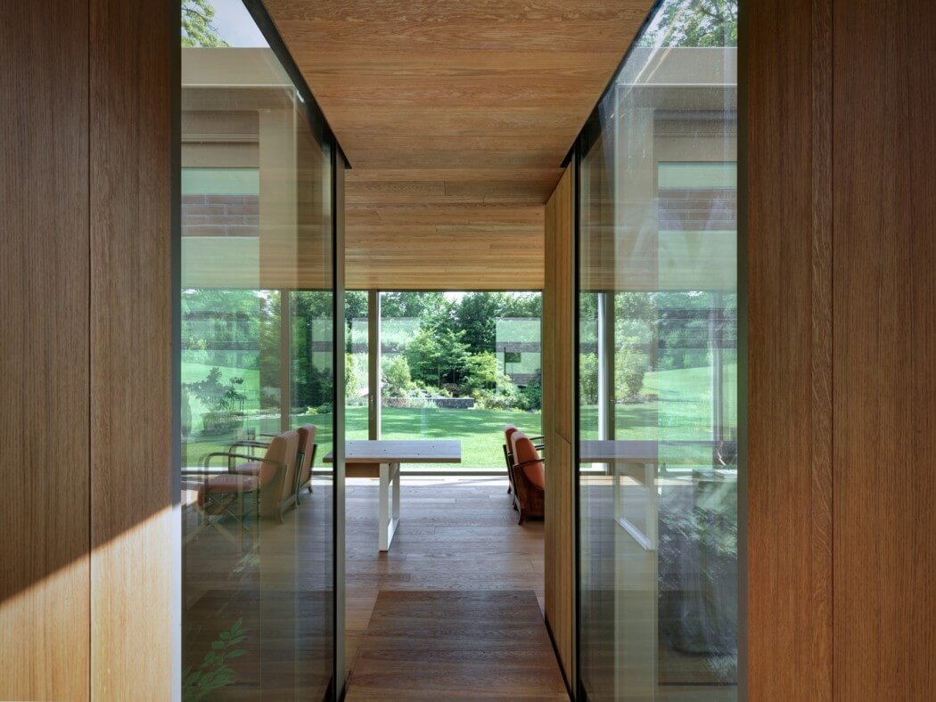 The west side of the pavilion (front) houses a sliding door. The door totally disappears into a structural cavity to maximize the connection with the surrounding artificial lake and parkland. In summer the indoor and outdoor spaces become one, a seamless conversation between both water surfaces (pool and lake) …..