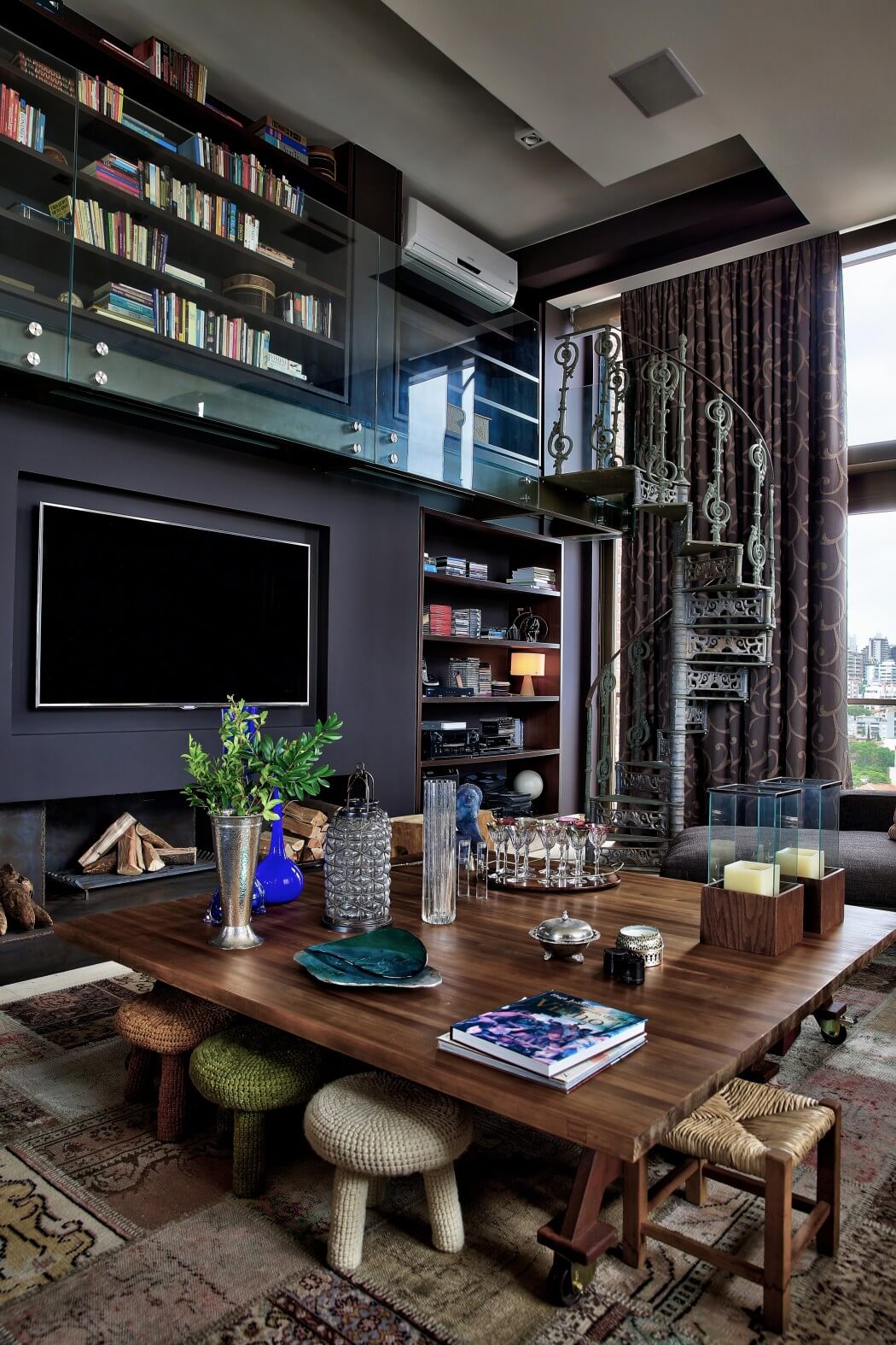 The choice of raisin dominant tone in the living room, in contrast to the differences found in the carpet and the subtle details of the big blind, who serves as blackout. The environment at the same time serious and behaved, gets a casual touch with the banks by the colorful coffee table.