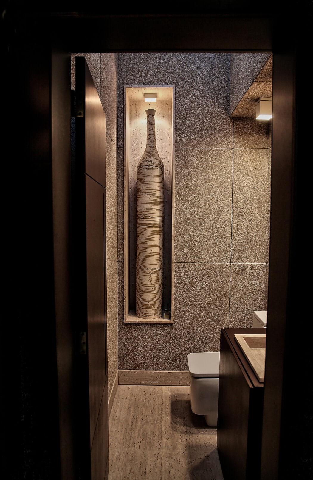 If the darker tones dominate the environment gets a unique brightness with large sheets of glass that surround the space, with breathtaking view of the city. Dark tones and earthy follow upholstery, furniture, and objects in the details, continuing the sequence a hue below the toilet, especially with a large lighted niche.