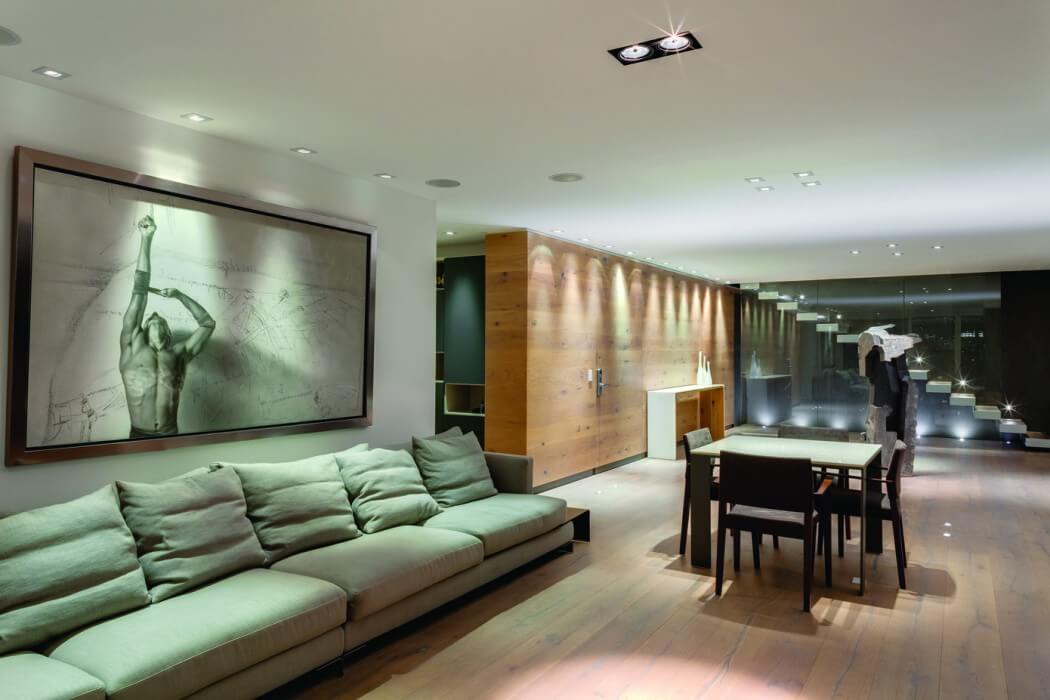 Penthouse with floating elements and open spaces with a sensitive balance between cold and warm materials