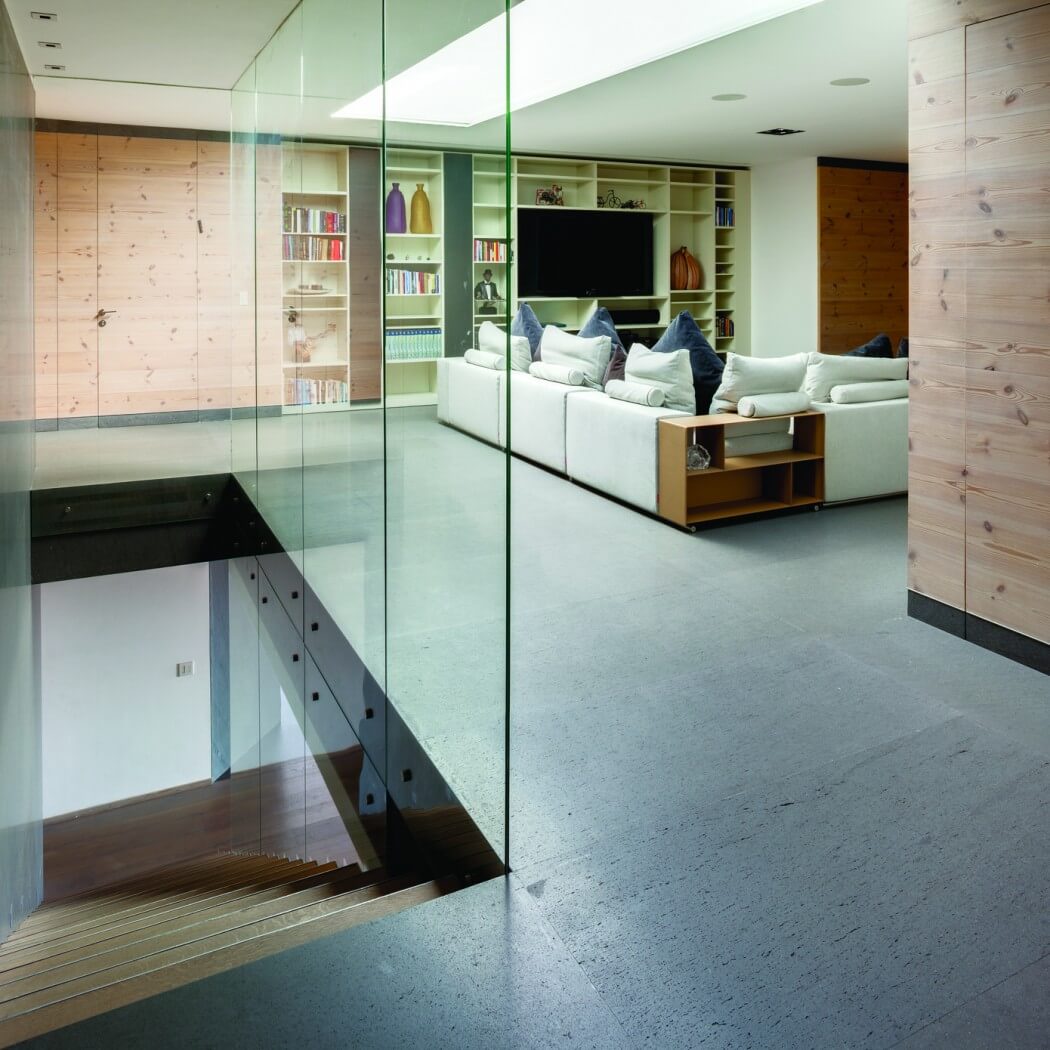 The lower floor of the project is designed for public, family areas: an entrance lobby, games room, study, living/dining room, visitors’ washroom, kitchen and a terrace.