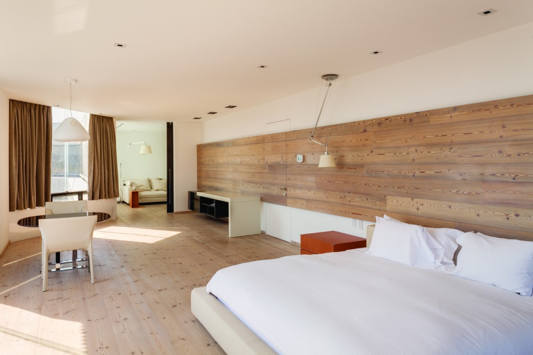 The private rooms are placed on the upper floor: a family TV room, three junior bedrooms, each with their own bathroom and closet, and a master suite with an antechamber and enormous dressing room/bathroom with expansive views over the city.