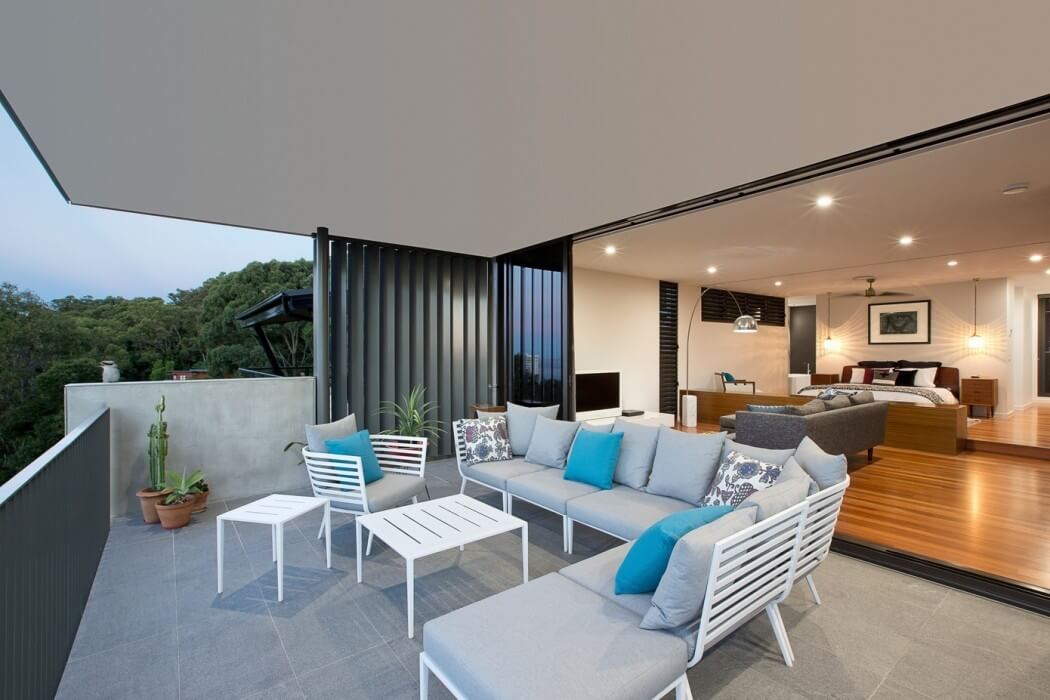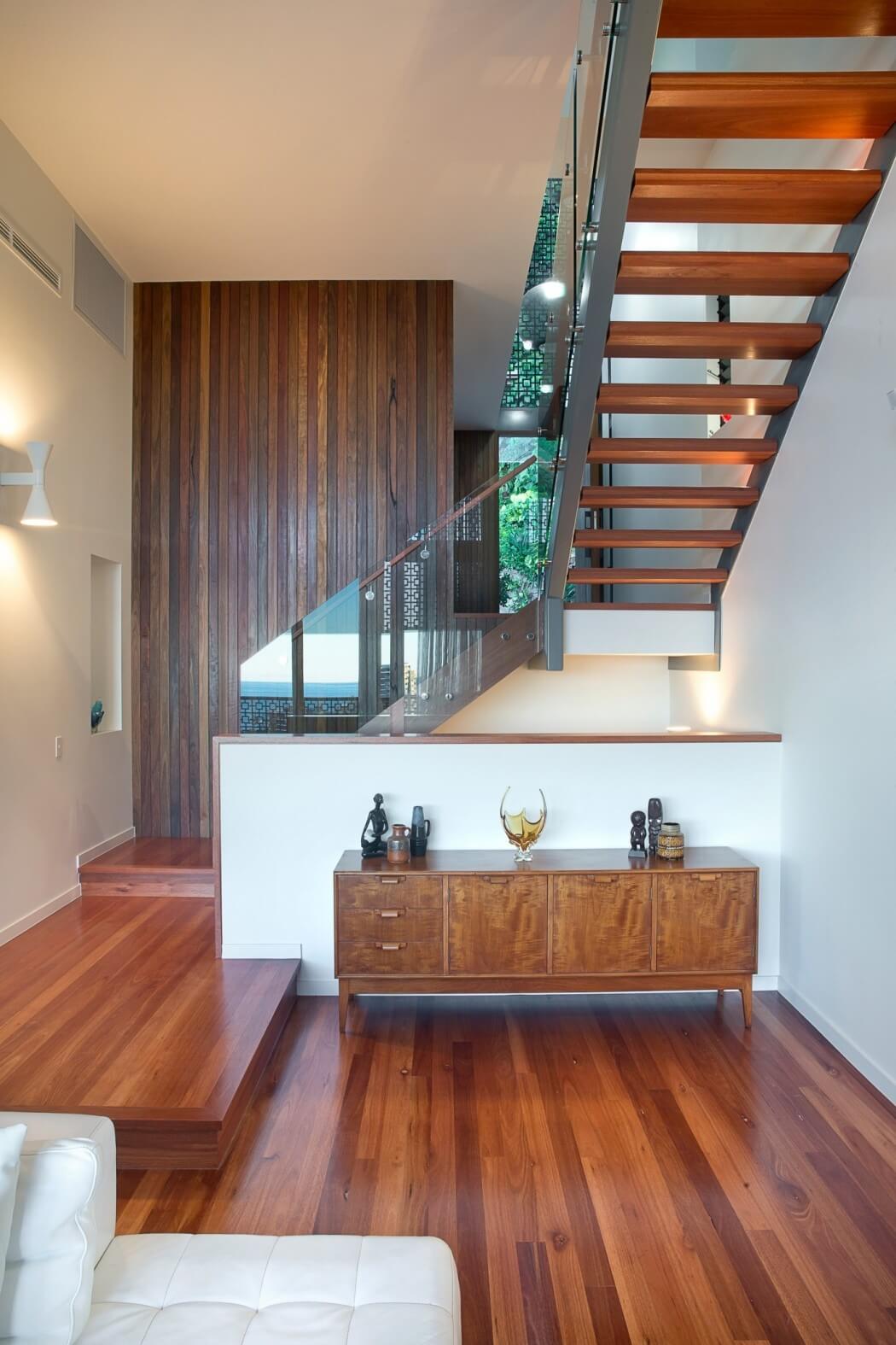 The new double height living area and expansive northern window opening up views to the Pacific Ocean and Gold Coast skyline is nothing short of impressive. Articulated with thoughtful glazing solutions and veiled in decorative screening for both sun control and privacy the façade can be adapted to suit the clients requirements. The placement of new windows and the use of solid operable louvres strengthened the connection to the green environment whilst still maintaining privacy from neighbours.