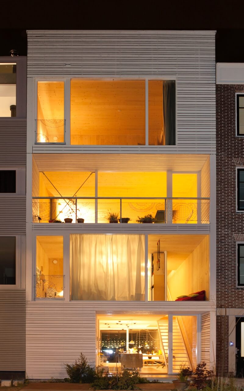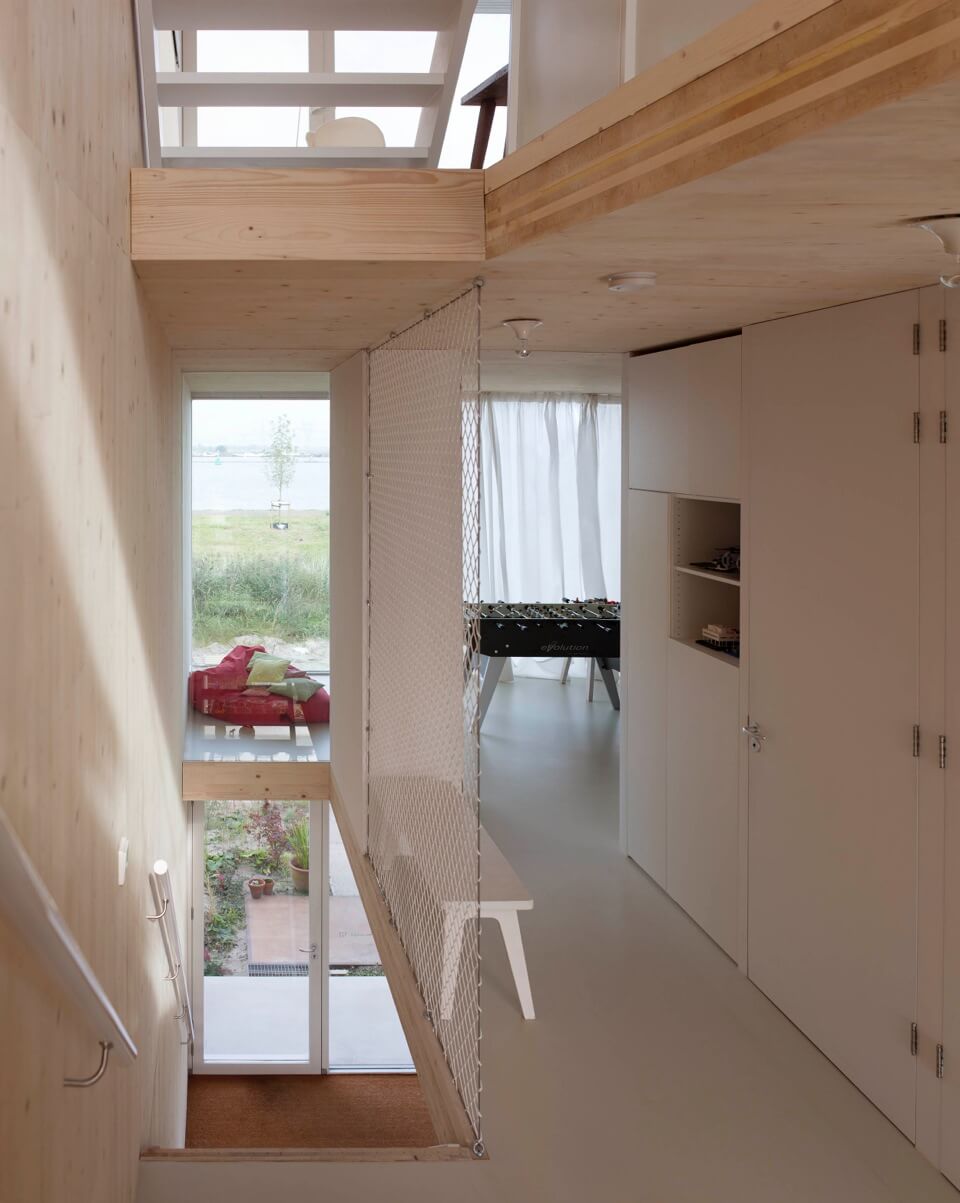 This transparent, daylight filled house is designed for a single family – two adults and two children– to live together in a comfortable, generous and open minded way. The house opens up on all levels: on the north side with magnificent view over the river IJ in Amsterdam and on the south towards the garden. Every level has a wide balcony to create a green buffer to possible later developments on the south side.