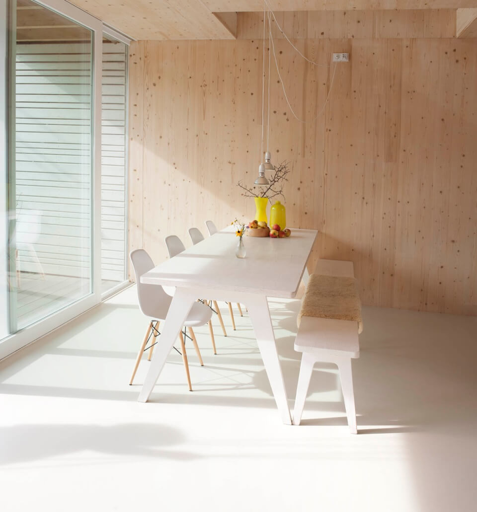 The house was completely constructed with massive wooden panels. All walls, floors and ceilings are prefabricated off site. Only the balcony and the stability construction on the second level are constructed in steel.