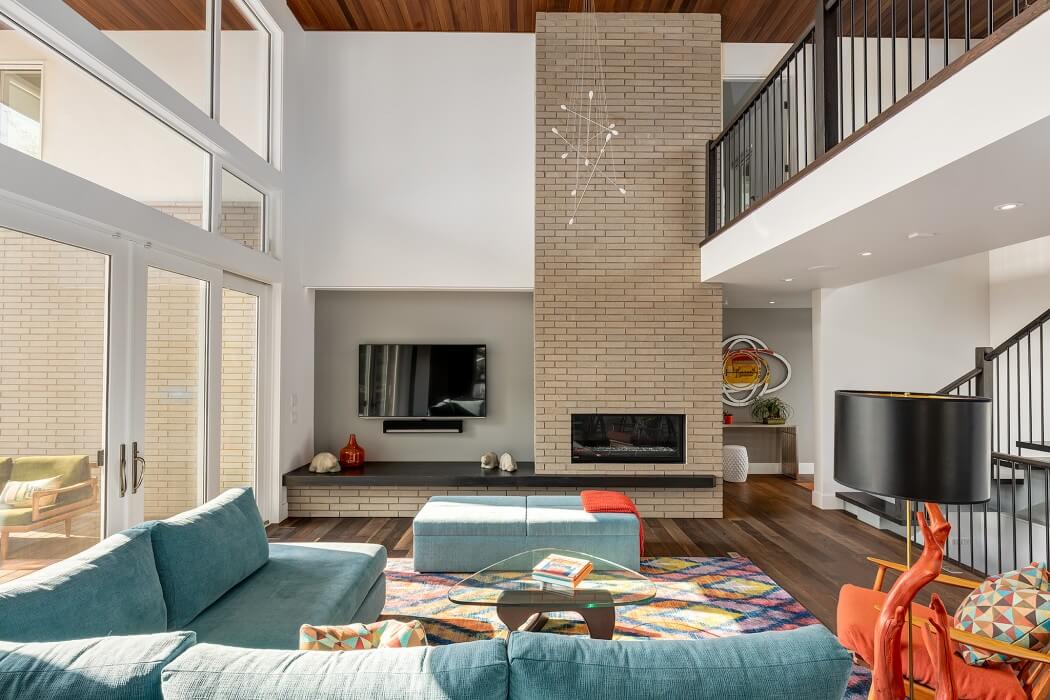 The main consideration for this design was to create a beautiful, timeless home that will suit their family’s needs as they change over time allowing for the three generations that will be sharing the home to be able to live their lives to the fullest under the same roof. An open plan to enhance entertaining with easy indoor outdoor access and a great BBQ area were secondary considerations. The plan needed to allow each group enough privacy and independence so that the home would meet their needs regardless of how many people were under its roof at a given time. The home is designed around a central indoor-outdoor living space that extends two storeys. The homeowners love to watch golf, and so the outdoor space was designed so that the TV can be easily viewed for comfortable, outdoor summertime golf watching. On the main floor, Keren’s suite is separated from the central living space by a double sided brick feature detail that houses the family hearth, TV, storage, and display shelving. The second storey is accessed via an open sculptural staircase and is divided into two distinct areas: the master suite, which includes a large bedroom, covered deck, walk-through closet and large ensuite; and the “kids wing” with bedrooms as well as bathing and laundry facilities. Keren’s suite has direct access to its own patio and has its own small sitting and living area that she can enjoy privately, and the master suite has a balcony that Steph and Jeremy can enjoy at their leisure. Both suites and the kid’s bedrooms are heavily sound proofed so that someone can sleep peacefully while the kids get ready for school or the adults can enjoy a movie in the living room after the kids have gone to bed.