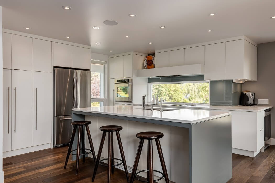 The interior and exterior finishing’s were selected to allow for Jeremy’s logical, more traditional sense of style to blend with Steph’s love of color and flair. The home’s color pallet in terms of walls, floors and cabinetry is very neutral and minimal, which allows for color to be added tastefully with furniture and art pieces. The exterior is a great example, white on all exterior walls with a splash of bright color on the door. The living room furniture is another great example, when you have a subtle overall interior look, bright pieces like the area rug and sofa add jolts of energy that balance the space and allow it to reflect the styles of the homeowners. The kitchen was designed with an open plan that allows for easy circulation when entertaining and has counter top space above a wine fridge at the edge of the kitchen for a potential bar or drink station. This allows guests to serve themselves while whomever is working in the kitchen has their own defined work space free of guest traffic. The outside BBQ area is just off to the side of the large patio doors at the back of the house, which lets the grill master (Jeremy) have quick easy access to the grill (important for long, cold Canadian winters!) without impeding any potential traffic flow between the indoor and outdoor spaces.