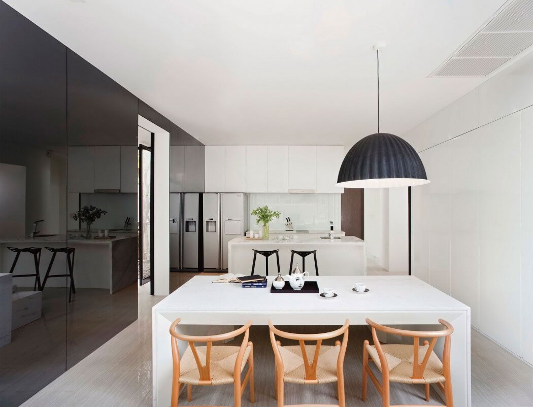 The main living space is located in the center as the floating pavilion where the family can enjoy the outdoor garden and swimming pool. The living space directly connects to the terrace, the garden and the swimming pool with double -height folding windows that facilitate the fusion of spaces. The approach of situating a swimming pool in the back of the house produces a space that is diverse and suitable to various activities.