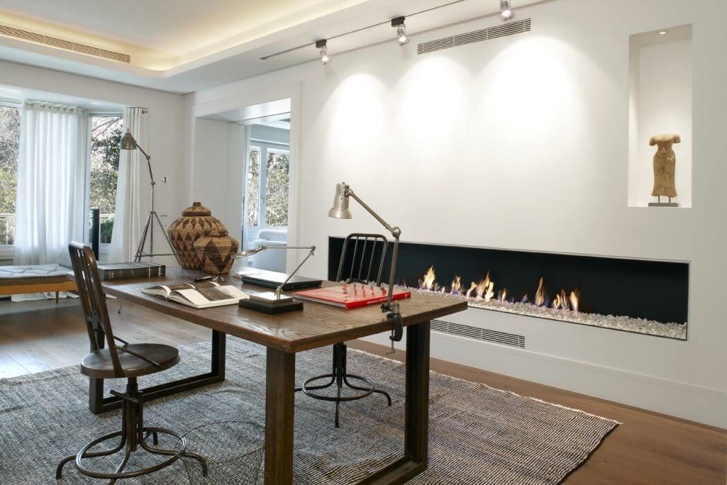 In the day zone; kitchen, office, pantry and laundry room. Dining room. Living room with a traditional fireplace and an office-library with a gas fireplace.
