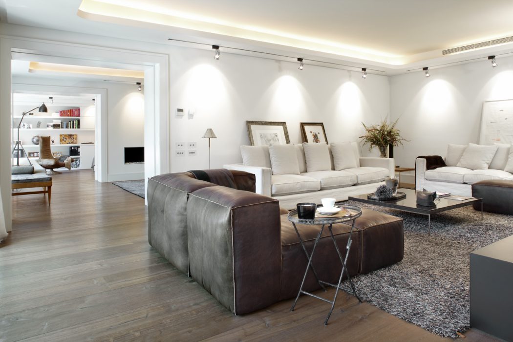 The formation of the ceilings at two heights, in the whole of the property, provides the solution for the passage of the installations, without renouncing maximum height. This double height is taken advantage of for housing indirect and adjustable perimeter lighting.