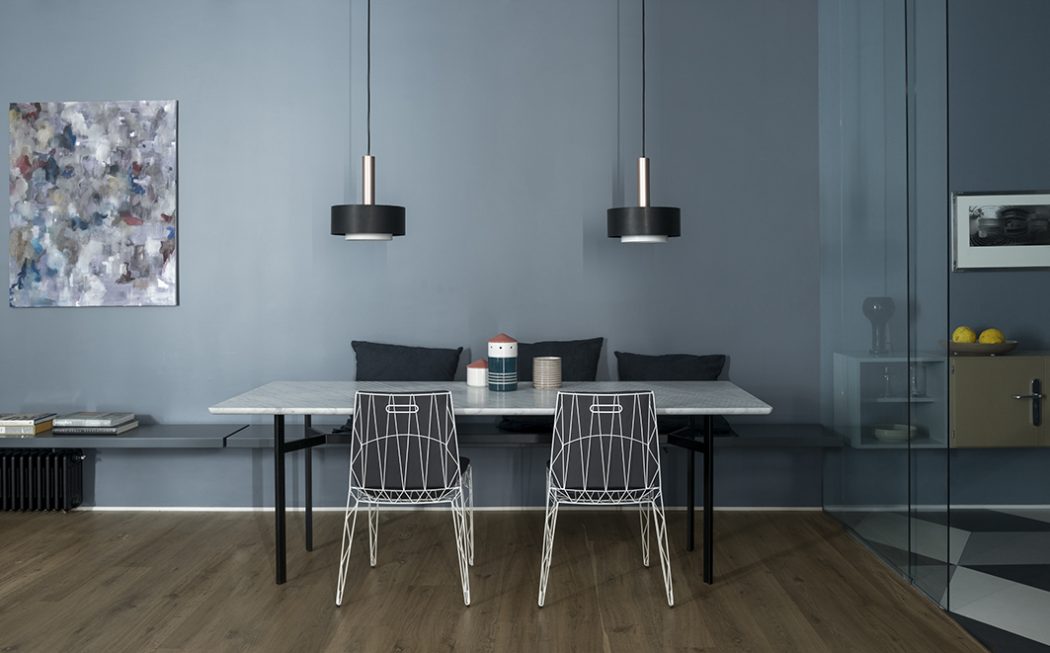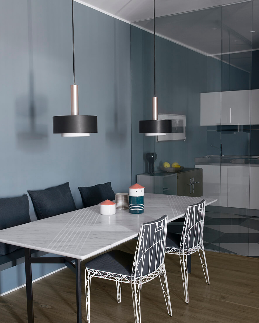 The new distribution, rigorous and practical, is the starting point for the other elements characterizing the project, realized through simple but studied gestures. Architectural solutions and customized furnishings such as the long bench of the dining area, an ideal prosecution of the living room wall, the glass partition in the kitchen and the visual continuity between the living area and the bedroom have been designed to add depth to a small space. At the same time geometric decorative accents characterise the apartment and are examples of the graphic language of the architect. The Escherian surfaces of the kitchen and the bathroom play indeed with the space and create an effect of subtle distortion using plain colors and rhythmic geometries.
