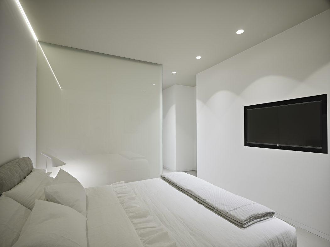 The lightning design revolves around the use of few LED track lighting fixtures, recessed from the line of the ceiling: they “wash” the walls whit light and create an evoking nonetheless “abstract” atmosphere. The only exception, on which the gaze is focused, is a pendant light suspended above the dining table, around which the family meets and shares time, good food and memories.
