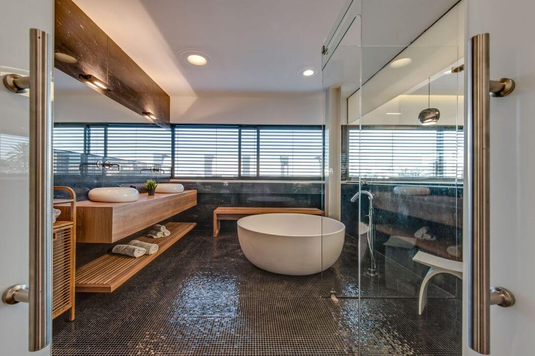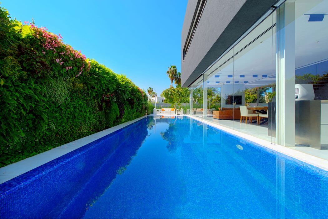 Another element that creates separation and drama between the floors, is building an all glass wall without any divisions throughout the entire ground floor, along the long edge parallel to the pool. In order to correctly utilize the characteristics of the plot, the pool was planned along the living room and kitchen in the area of the “pathway”, which is not utilized, and so a seating area is preserved in the narrower side.