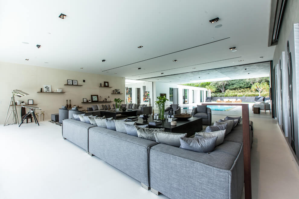 Set in prime lower Beverly Hills. Epic scale with walls of glass that disappear and blur the line between indoor/outdoors. Zero edge infinity pool. Covered outdoor living room. Designed for large scale entertaining, the vast Living Room offers exceptionally high ceilings and converts to a luxurious Screening Room. State of the art Bulthaup Kitchen. Full Catering Kitchen. Formal Dining Room with fireplace. Lucite wine cellar. Master Suite with views of Beverly Hills and closets that rival the finest stores on Rodeo Drive. Master Bath clad in book matched Calacatta slab marble. Four additional cabana suites, each with walls of glass opening to the grounds and pool beyond. Attached staff quarters. Private behind discrete gates, large motor court with ample off-street parking. A Radiant Modern Estate in the finest location.