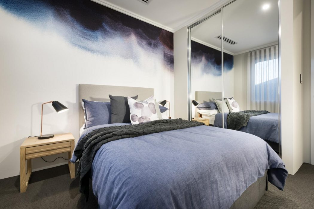 The bedrooms at Piara Waters House offer a blend of luxury and comfort. The master bedroom features a bold accent wall and ample natural light. The ensuite bathroom, accessible through a sleek sliding door, includes modern fixtures and a spacious layout. Other bedrooms continue the theme of modern elegance, with comfortable bedding, stylish decor, and thoughtful design elements.