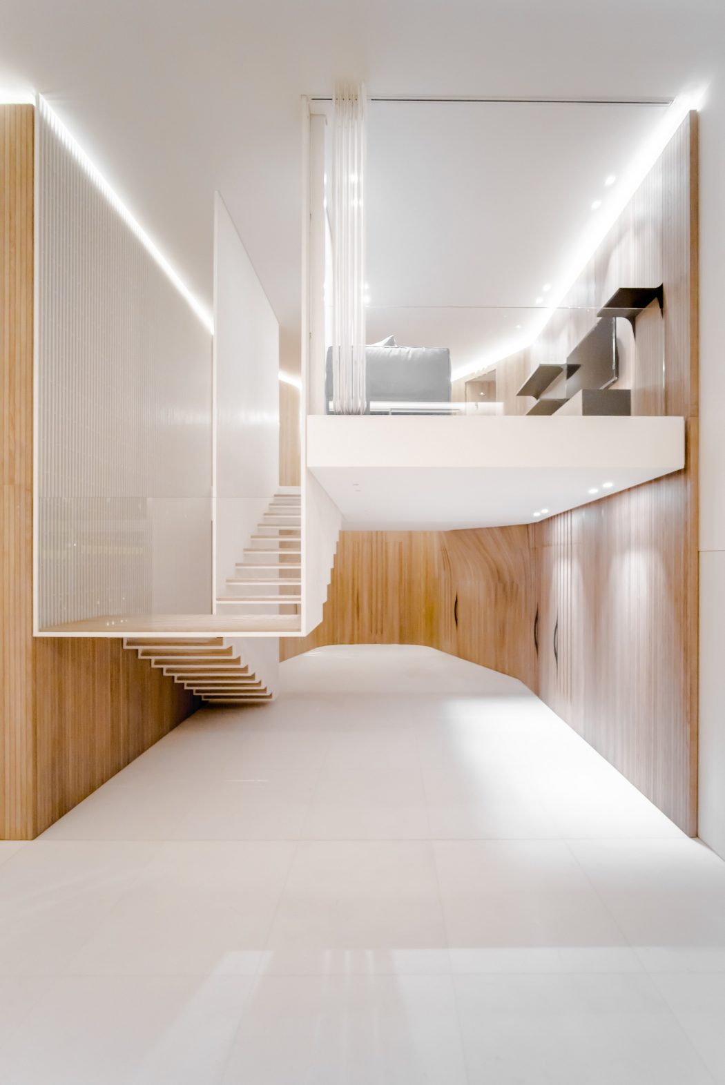Moving upwards, the private areas of the penthouse continue the design narrative. The bedrooms and work areas are defined by the same wooden skin that wraps the lower floor, providing a seamless visual and functional continuity. Each room features white walls and marble floors, creating a bright and reflective palette that contrasts beautifully with the wooden elements.