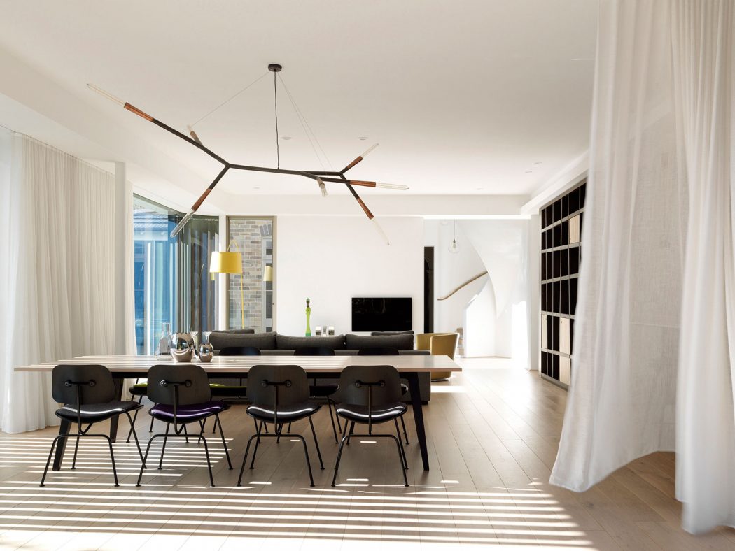 The connection between the old and new sections is most striking in the elliptical staircase that spirals up from the ground floor. This architectural feature not only serves as a functional element connecting the two levels but also as a sculptural focal point that embodies the home’s modern spirit.