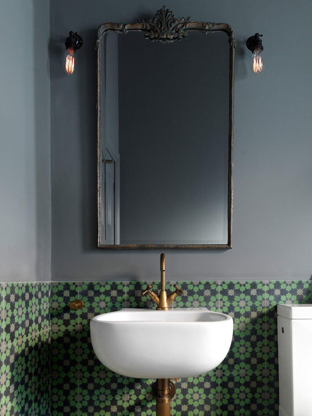 Concluding the interior tour, the master bathroom stands out with its combination of vintage and contemporary styles. A classic mirror juxtaposes against modern tiling, creating a space that is both stylish and functional.
