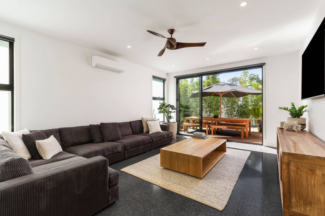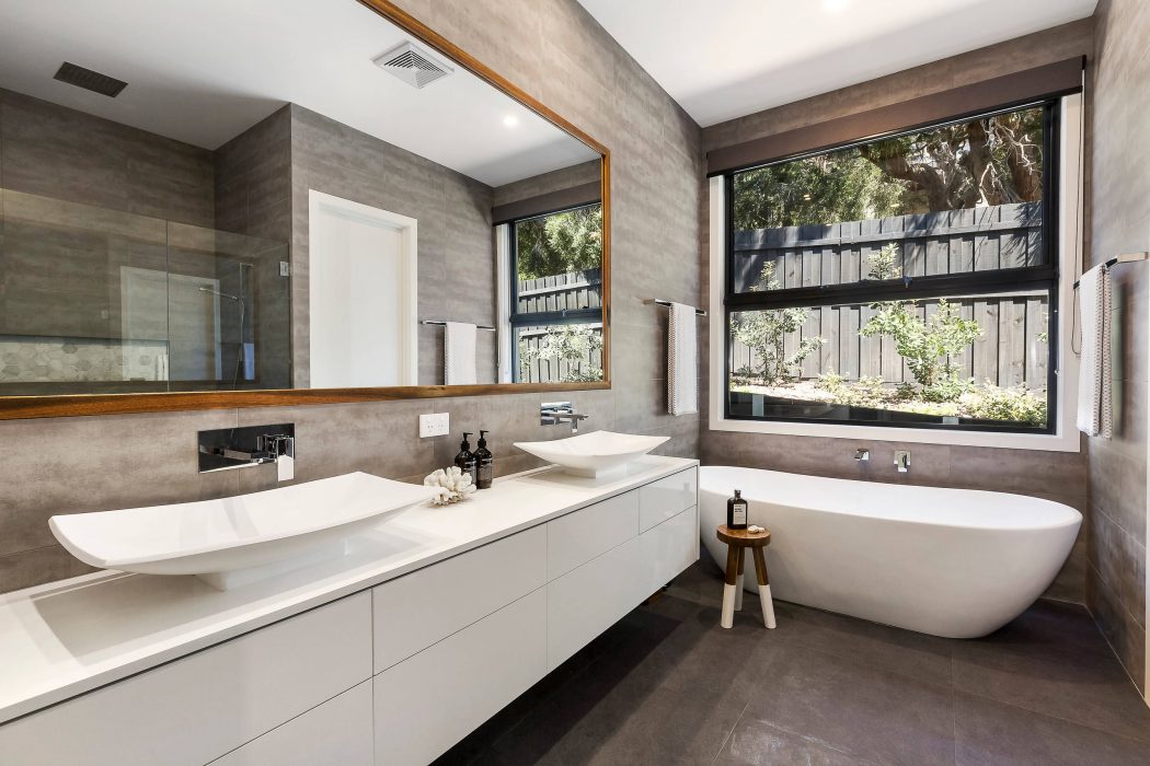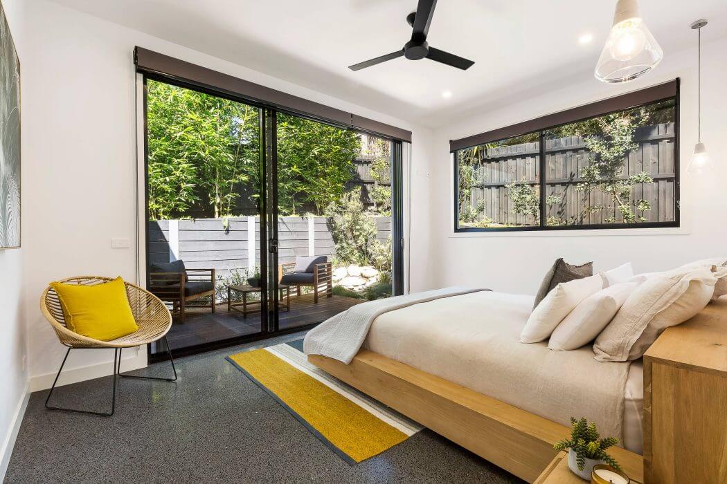The bedrooms of the House in Blairgowrie offer private retreats with direct access to the outdoors, fostering a connection with nature. Minimalistic decor and large windows create bright, airy environments that encourage relaxation. The bathrooms are styled with sophistication, featuring frameless glass, sleek fixtures, and a freestanding bathtub, positioned strategically to overlook a private garden view.