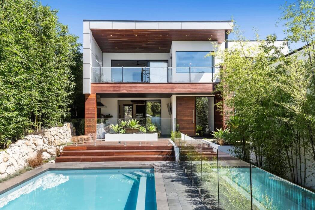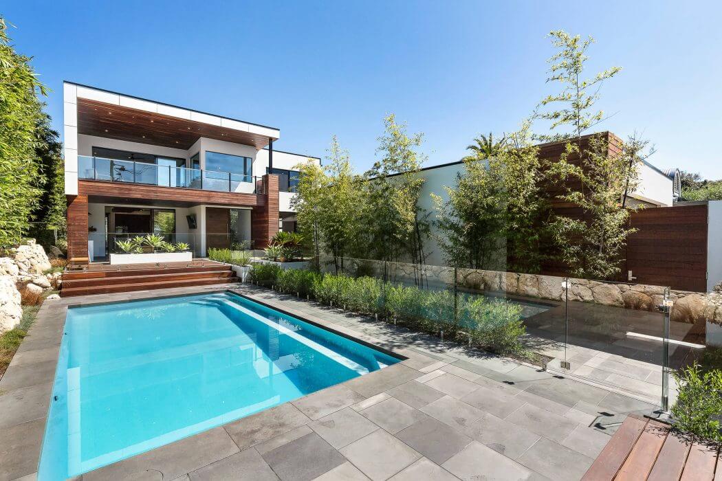 The “House in Blairgowrie,” designed by Vistalab in 2015, stands as a striking contemporary two-storey house in Blairgowrie, Australia. The exterior presents a blend of modern design elements, combining clean lines with natural materials. Expansive glass panels and wooden cladding enhance its open feel while connecting the home to the surrounding landscapes. The outdoor area features a crystal-clear swimming pool, bordered by lush gardens and sleek decking, making it an ideal setting for relaxation and entertainment.