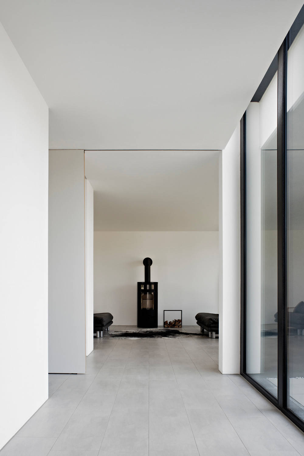 Inside House K, the journey begins in a spacious living room, where daylight and nature enter freely through large windows, blurring the lines between indoors and out. The interior, a masterful display of restraint, features a simple color palette and clean furnishings. This space offers a canvas for life’s daily rhythms, grounded by a fireplace that provides both warmth and a natural gathering point.