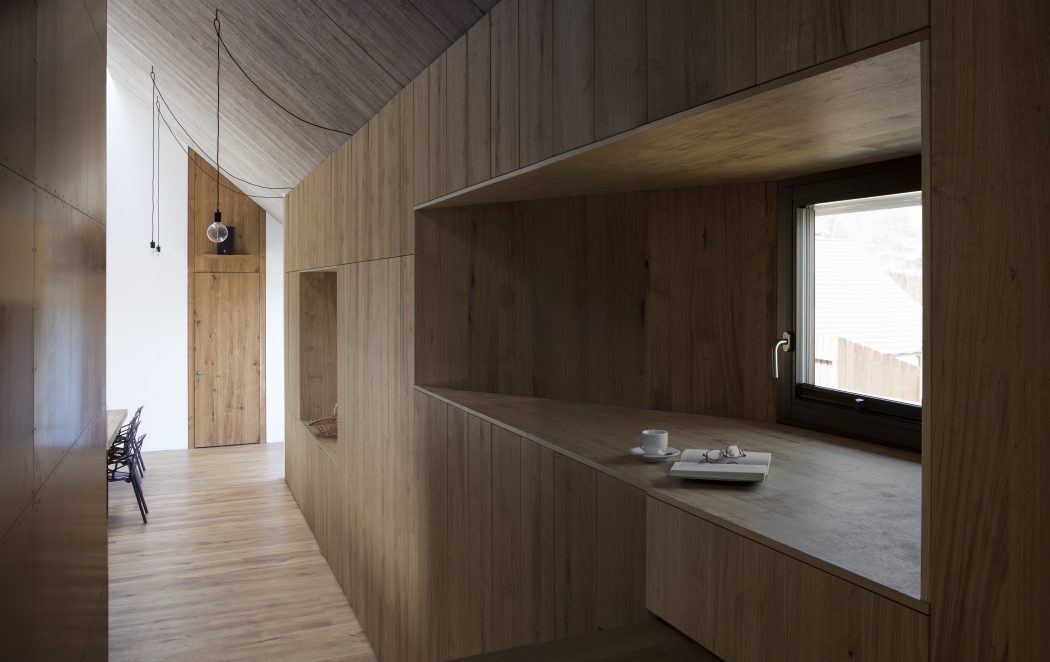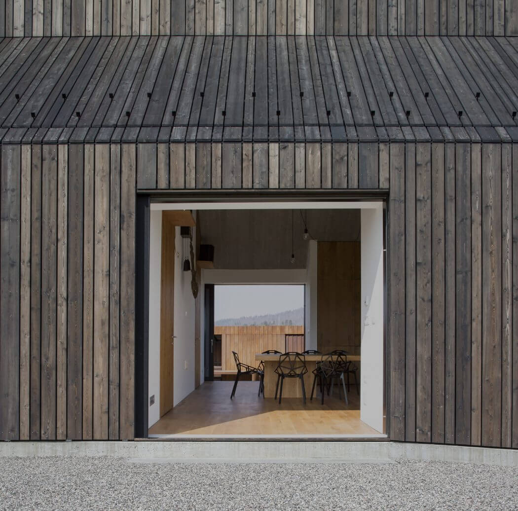 Situated on the village edge, the house connects with the traditional wooden barn through its dark wooden exterior. However, it also forges its own identity by engaging in a visual conversation with the nearby 16th-century church.