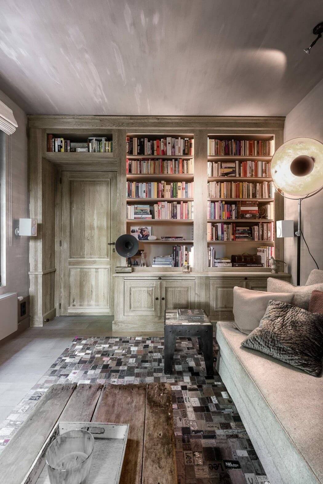 The study carves out a space for reflection and creativity. Floor-to-ceiling bookshelves brim with literature, and the natural light highlights the room’s textural contrasts, from the wooden floor to the soft furnishings.