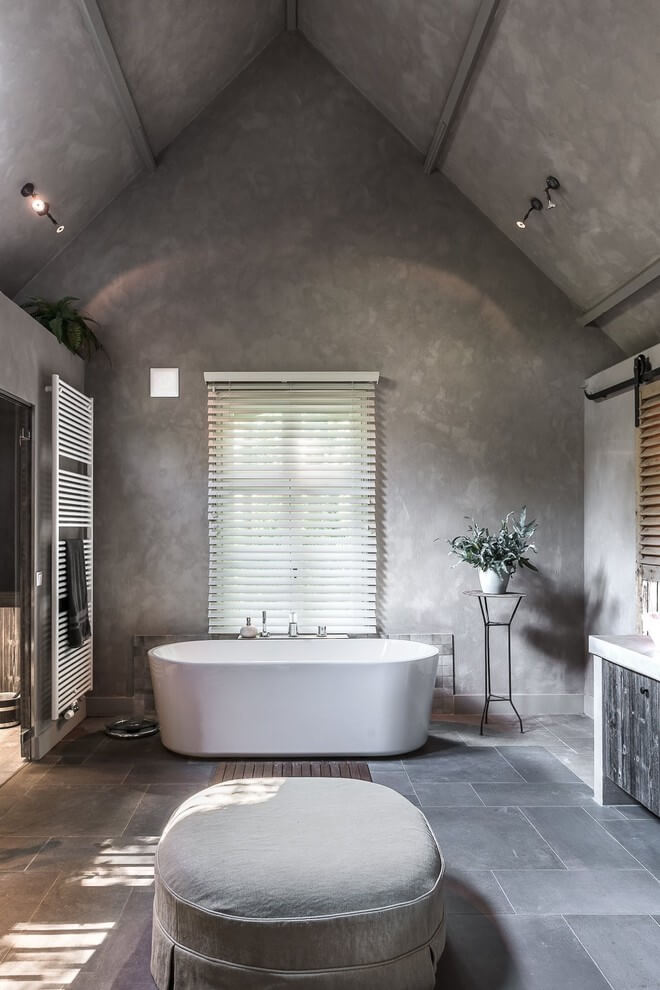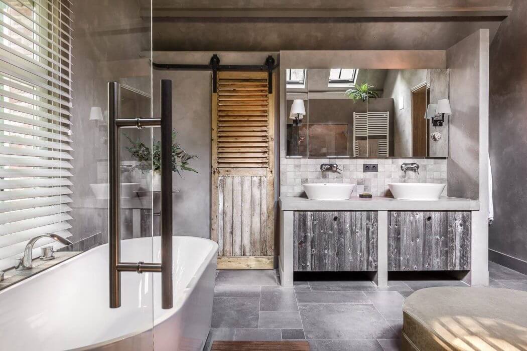 Each bedroom in Home in Antwerp serves as a private haven. The master suite’s neutral tones and luxurious fabrics provide a calming backdrop, ensuring a restful sleep. The adjoining bathroom, with its freestanding tub and vaulted ceilings, offers a spa-like experience, reinforcing the home’s overarching sense of retreat.