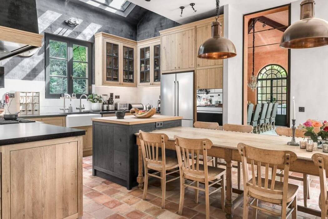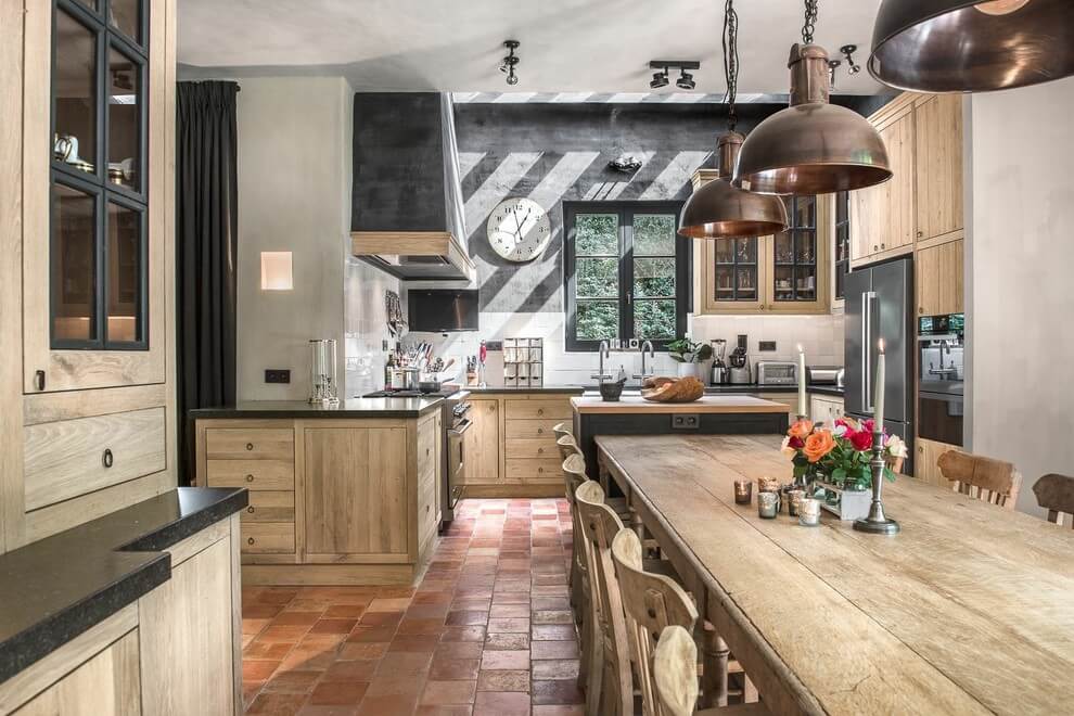 The kitchen combines modern amenities with rustic design elements. Wooden cabinets and a central island offer functionality, while terracotta tiles and natural light make the space inviting. It’s a hub of activity, designed to be both practical and pleasing to the eye.