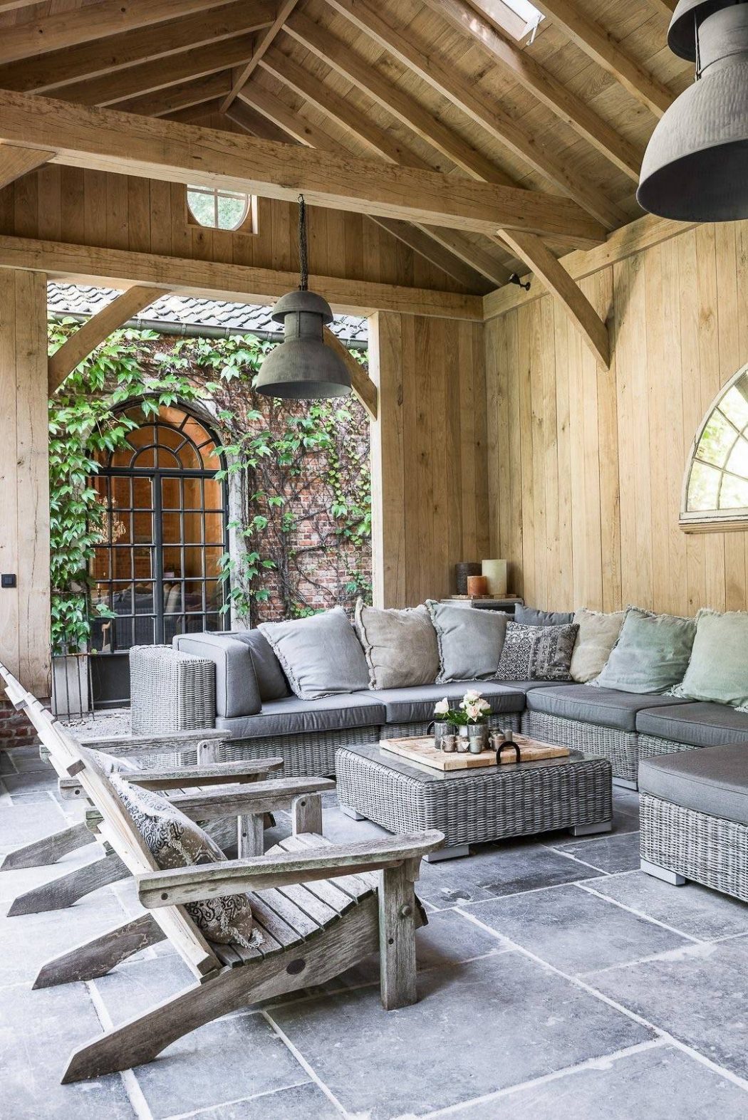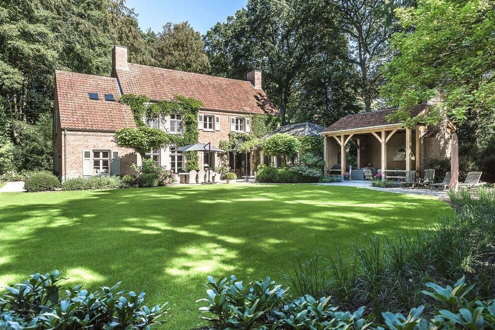 As you approach Home in Antwerp, its traditional brick exterior, draped in natural foliage, promises a timeless connection with nature. The sprawling lawn complements the red brick façade, inviting one to explore the outdoor living spaces. Each element, from the climbing ivy to the open-air veranda, adds to the house’s warm welcome.