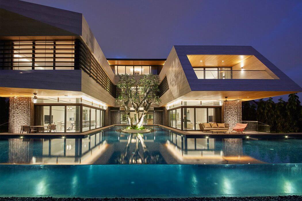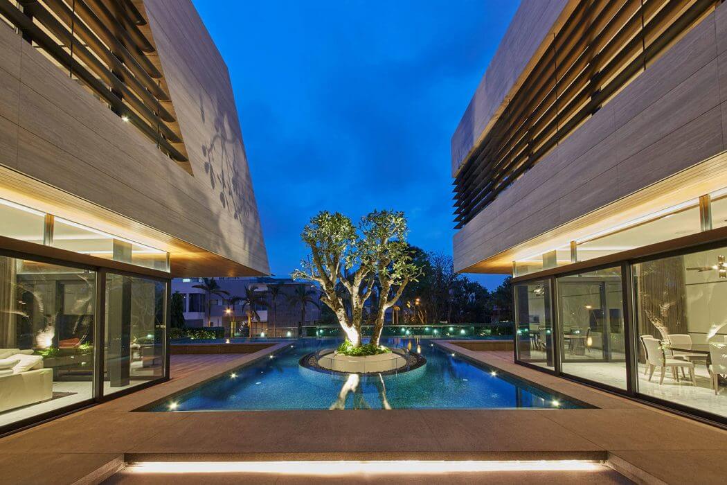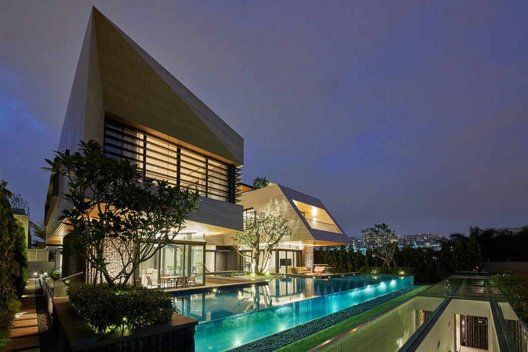 The journey into this architectural feat begins with its striking exterior. Illuminated against the Singapore skyline, the house presents a bold series of horizontal lines and planes. As evening falls, strategically placed lighting accentuates the texture of natural materials and the lush landscaping surrounding the entrance.