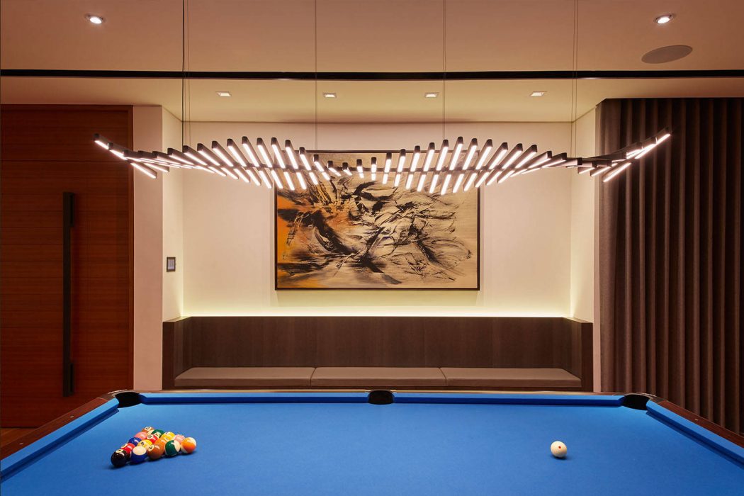 Recreation comes alive in the game room, where a pool table awaits under an artistically arranged ceiling light, encouraging playful competition.