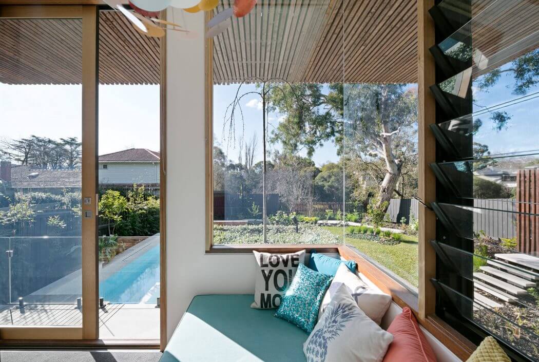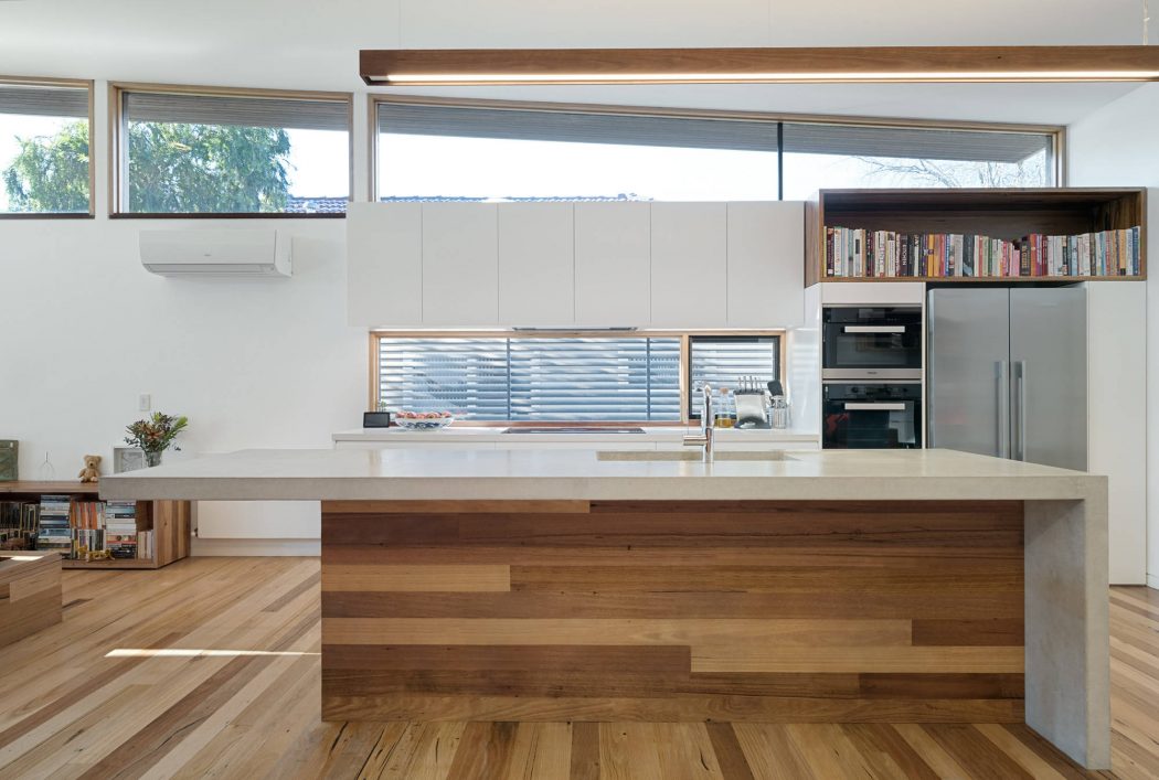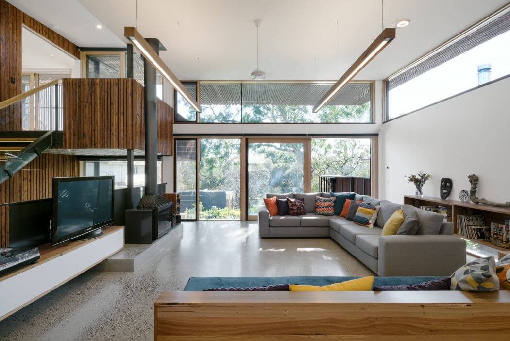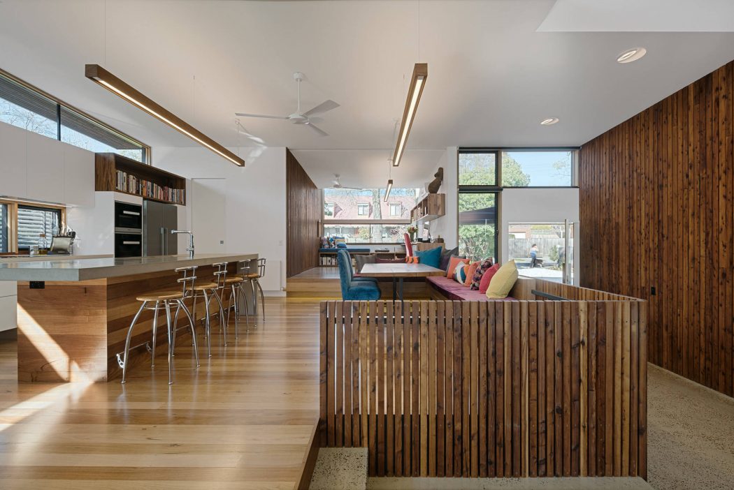 As you approach Trail House, its external beauty is immediate. The home sits comfortably on the land, complementing the gentle slope of its suburban Melbourne surroundings. Its facade showcases natural materials that speak to the landscape, providing a seamless transition from the urban environment to a personal oasis. The wooden exterior, punctuated by large windows, invites the outside in, promising a light-filled interior that celebrates the sun’s path.