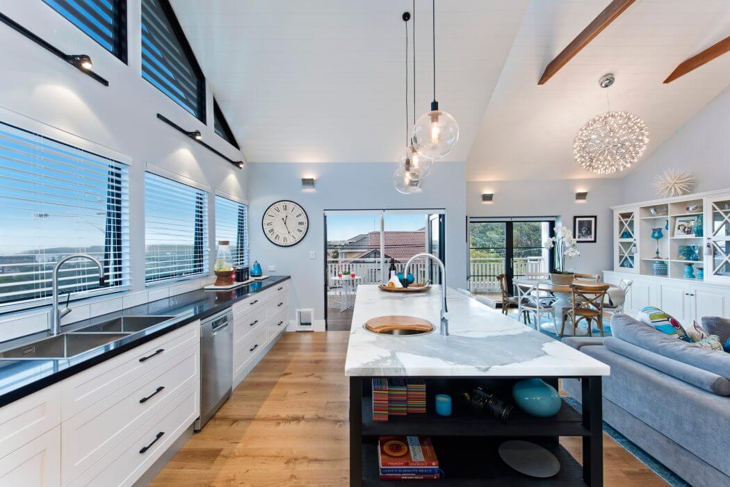 The adjoining dining area continues the home’s airy theme, with furnishings that echo the simplicity and lightness of beachfront dining. Natural light floods in through ample windows, enhancing the home’s spaciousness. Here, family meals and friendly chats find a perfect backdrop.