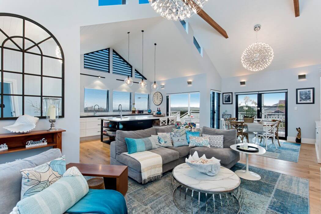 Adjacent to the dining space, the living room invites relaxation. A plush sofa, adorned with cushions in hues of the ocean, offers a comfortable nook for unwinding. The decoration is thoughtful yet understated, with elements like a statement light fixture providing a subtle nod to the coastal setting.