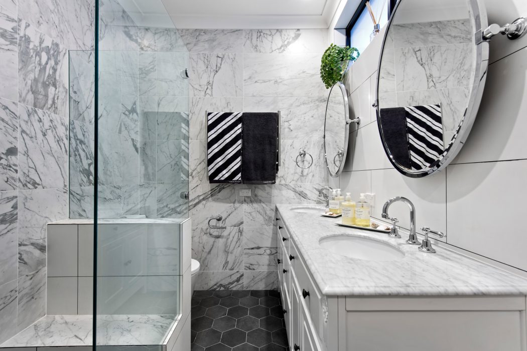 As we move further into the home, a bathroom displays a mastery of modern luxury. Marble envelopes the space, from the large shower enclosure to the expansive vanity. Here, form meets function in the finest details, including sleek fixtures and tasteful storage solutions.