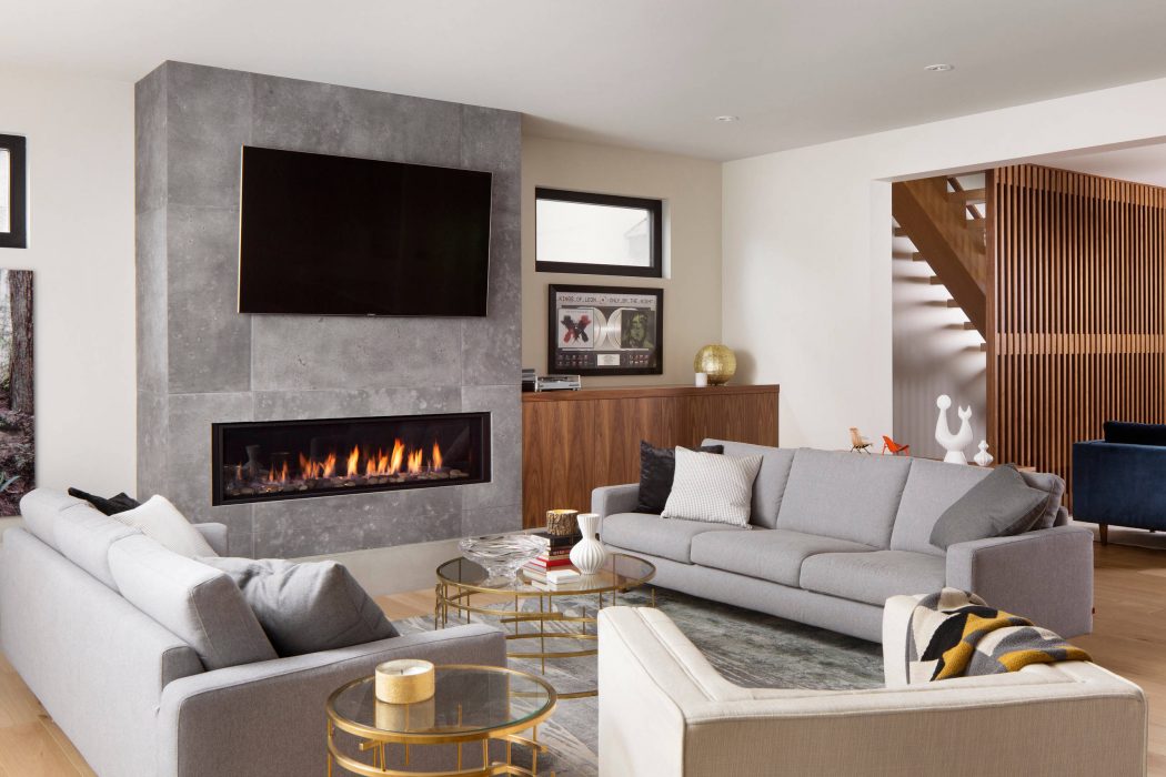 The private quarters do not shy away from the home’s design narrative. In the bedroom, a minimalist fireplace anchors the space, while thoughtful details, like the vibrant yellow throw, add a layer of warmth. Each room transitions effortlessly into the next, culminating in a cohesive narrative that Johnson Interior Design envisioned.