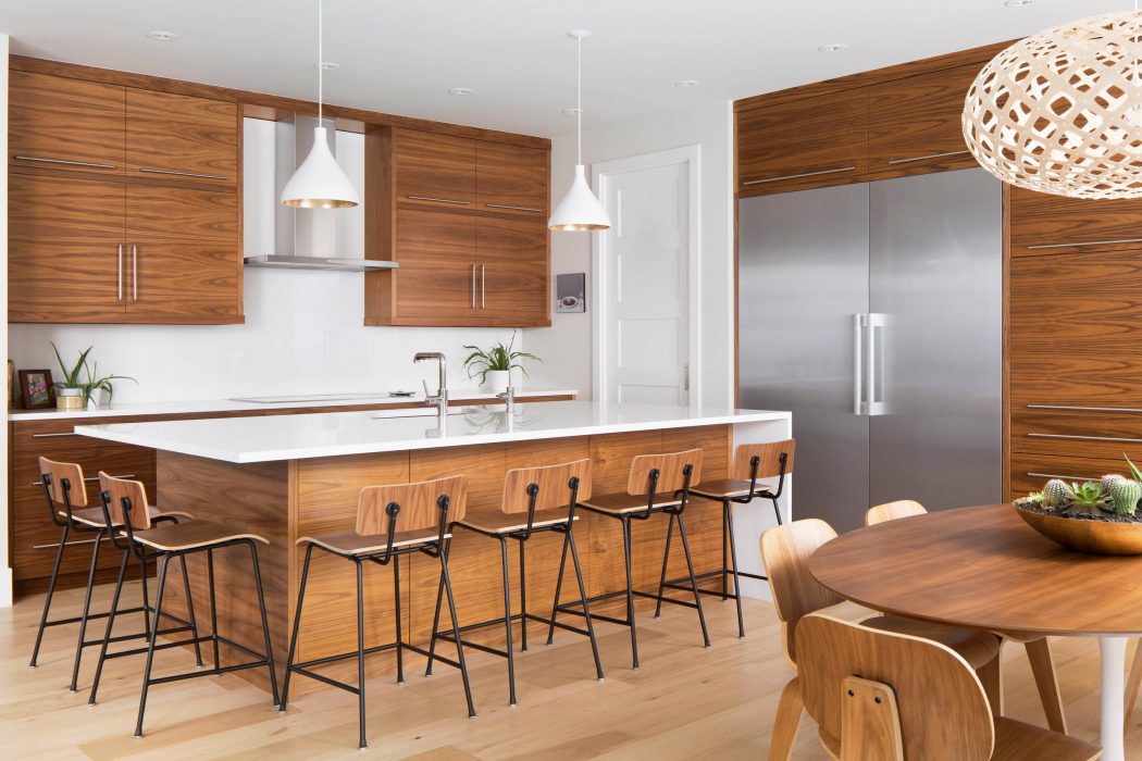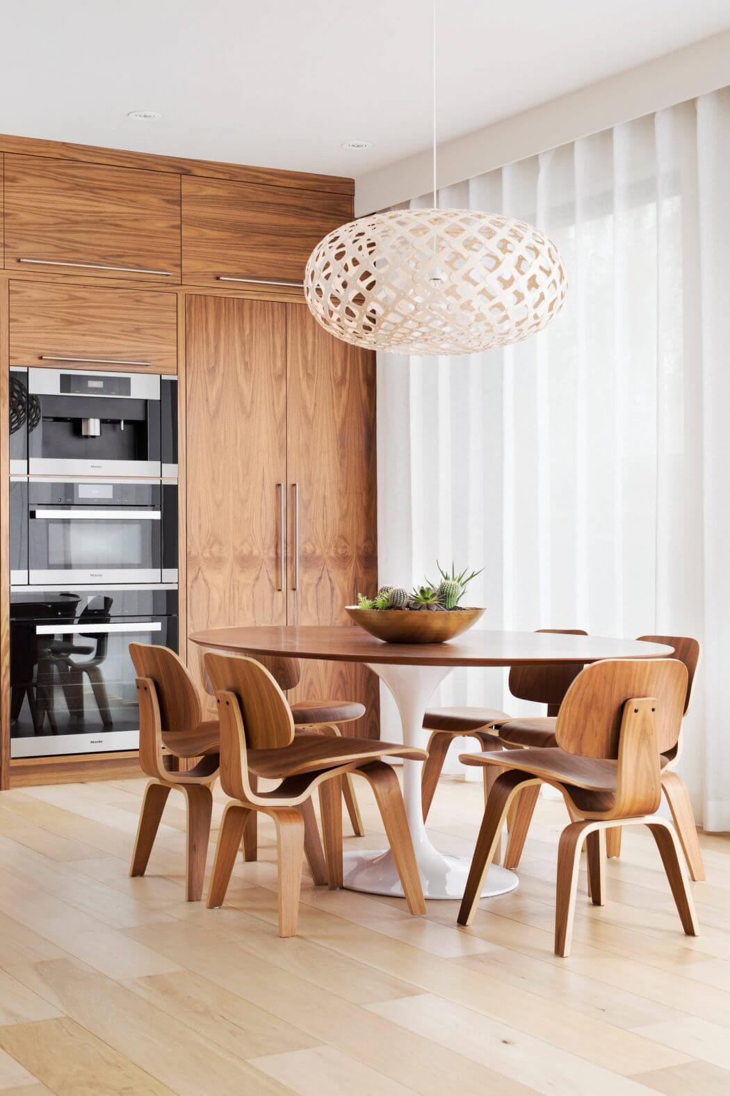 Move into the kitchen, where functionality meets style. The walnut cabinetry aligns with the home’s modern ethos, offering ample storage and an aesthetic link to the adjacent dining area. Here, natural light dances across a wooden table set, complemented by sculptural chairs that echo the kitchen’s sleek design.