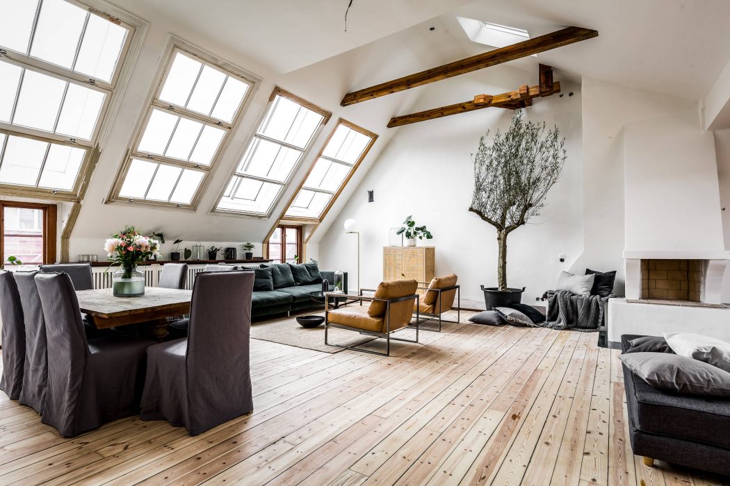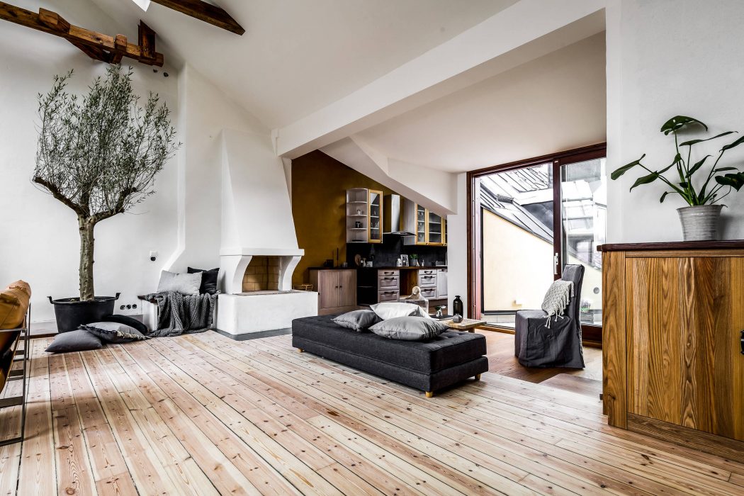 Spacious loft-style living space with rustic wood beams, modern furniture, and potted plant.