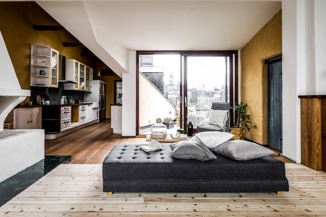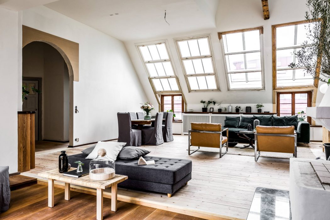 Airy loft-style living room with large windows, wooden beams, and a mix of modern and rustic furnishings.