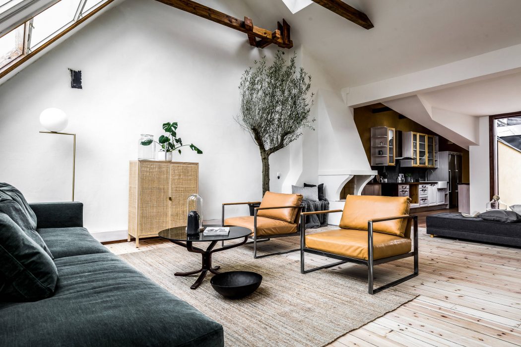 Cozy attic living room with rustic wooden beams, modern furniture, and natural plant decor.