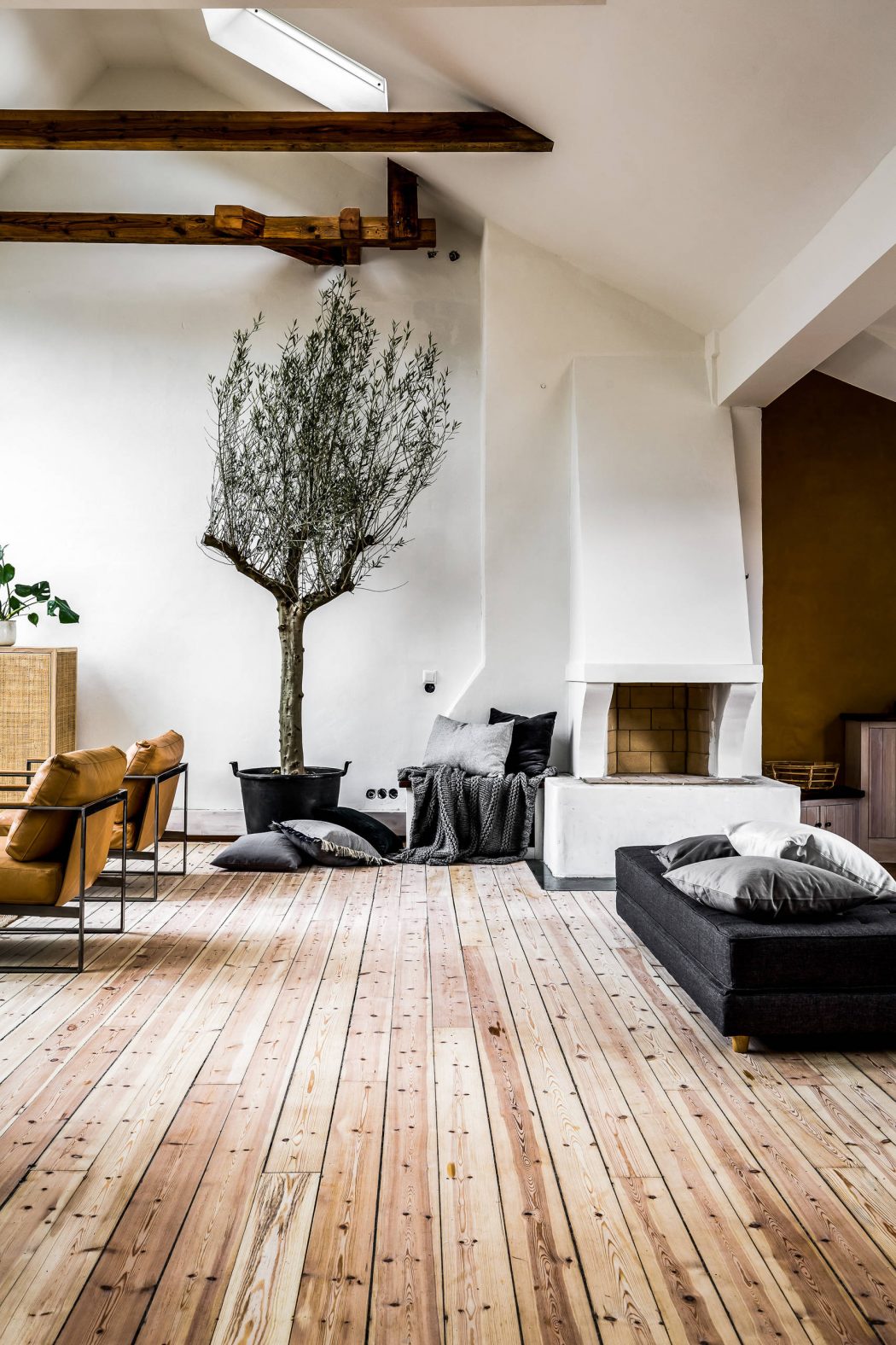 The living room greets guests with ample natural light spilling through skylights. A blend of leather and wood furnishings grounds the space, while white walls keep it airy and inviting. The unexpected presence of an indoor olive tree adds a touch of organic elegance.