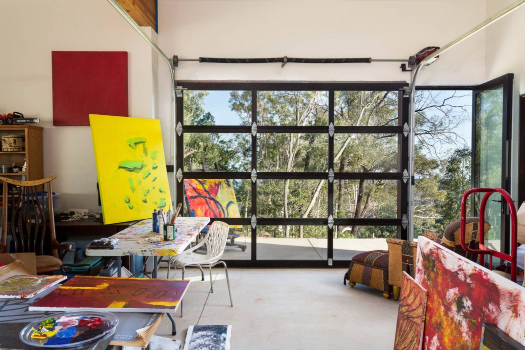 The exterior of the building offers a captivating mix of materials. It combines plaster, weathering steel, expansive sliding doors, and an array of windows, both punched and clerestory. A separate garage, complete with an artist’s workshop, enhances the home’s features.