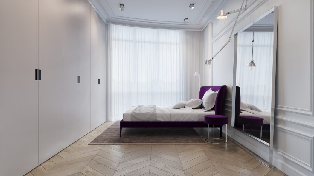 Move into the bedroom, where simplicity reigns, free from clutter and distraction. The bold purple bed provides a pop of color that contrasts with the tranquil hues of the room. The journey continues to the bathroom, a space that showcases a mastery of design with marble textures and modern fixtures, reflecting both function and fashion.