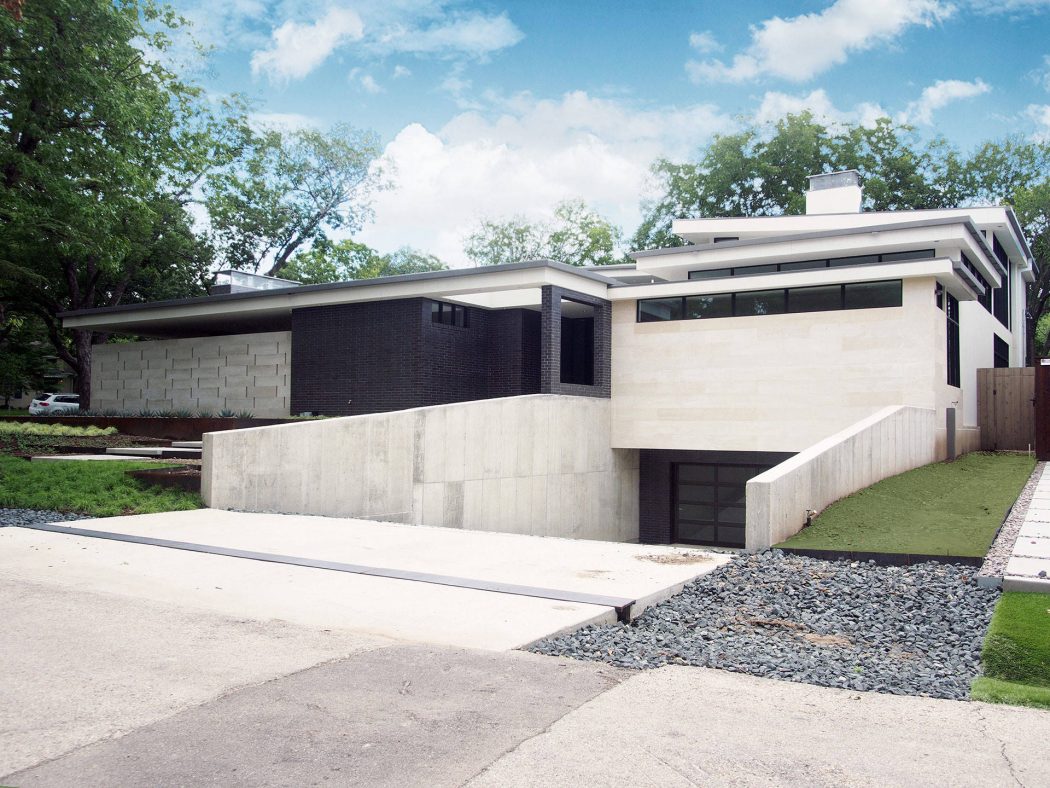 A flat overhang casts a protective shade over the House in Dallas, harmonizing with the high windows that punctuate its façade. The entrance invites guests with a cascade of steps, framed by the thoughtful landscaping of Garthoff Designs. A massive cantilevered patio hints at the grandeur within, promising an ideal space for entertainment.
